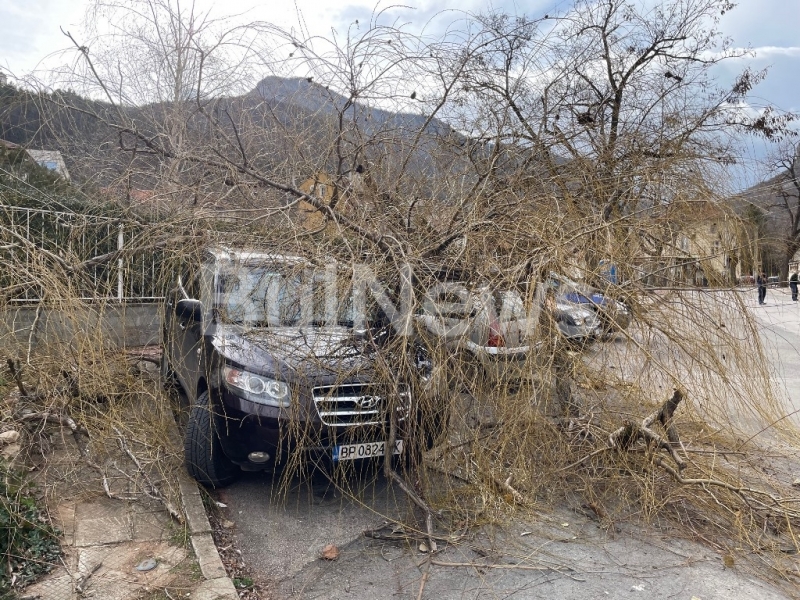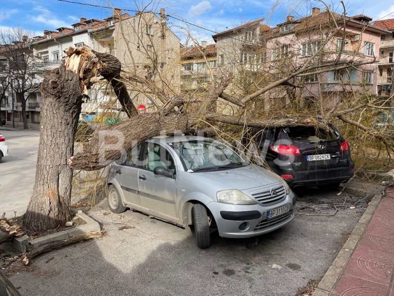 Опасното време във Враца вече нанесе поражения, видя първо репортер на агенция BulNews. Огромно дърво е паднало върху две коли в центъра на града.