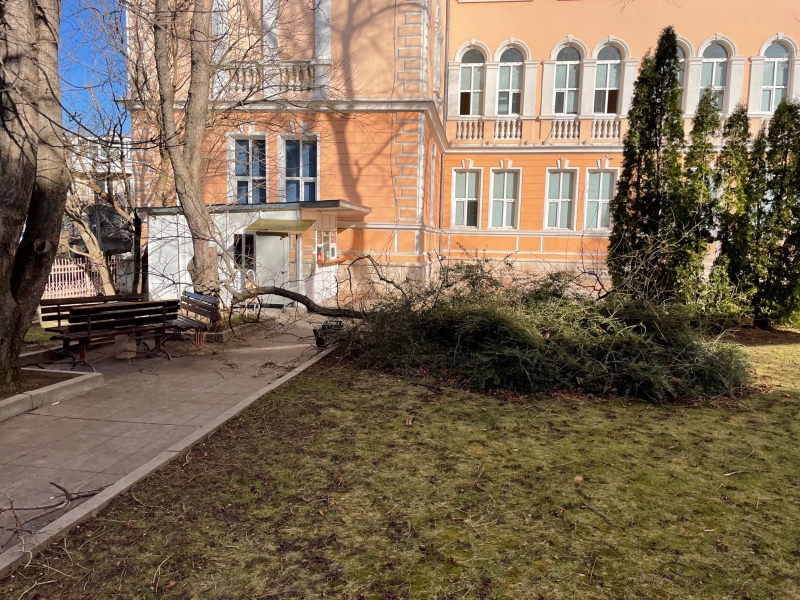 Силният вятър отчупи клони и понесе пейки в двора на СУ „Христо Ботев“ във Враца /снимки/