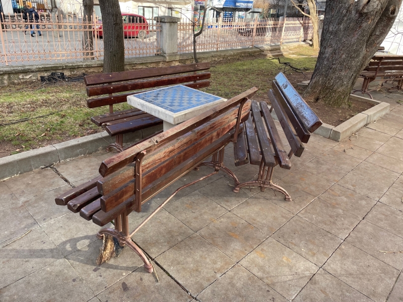 Поривите, които се извиват от вчера над областния център, са толкова силни, че са поместили и част от металните пейки, които са поставени в двора на врачанската Алма Матер.
