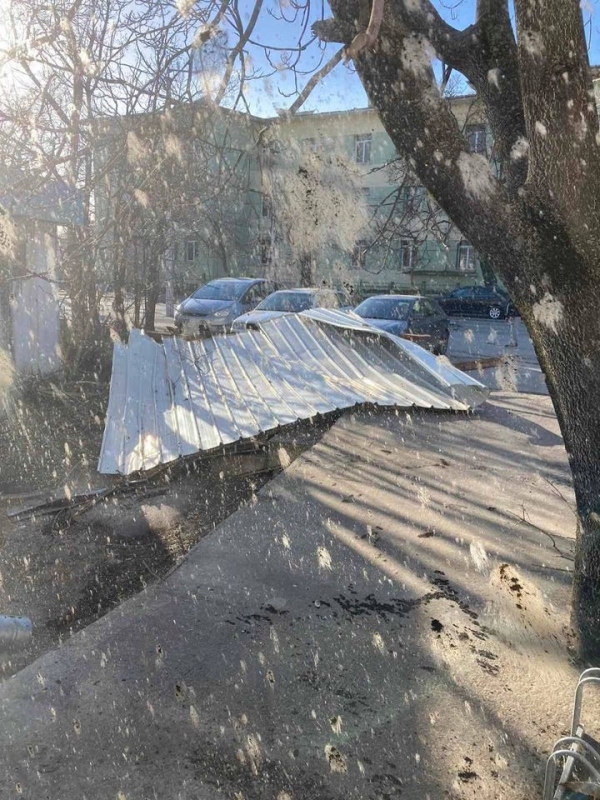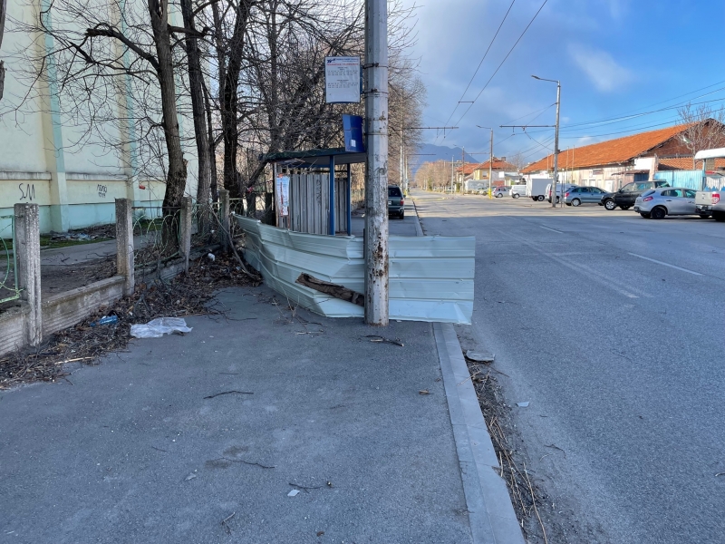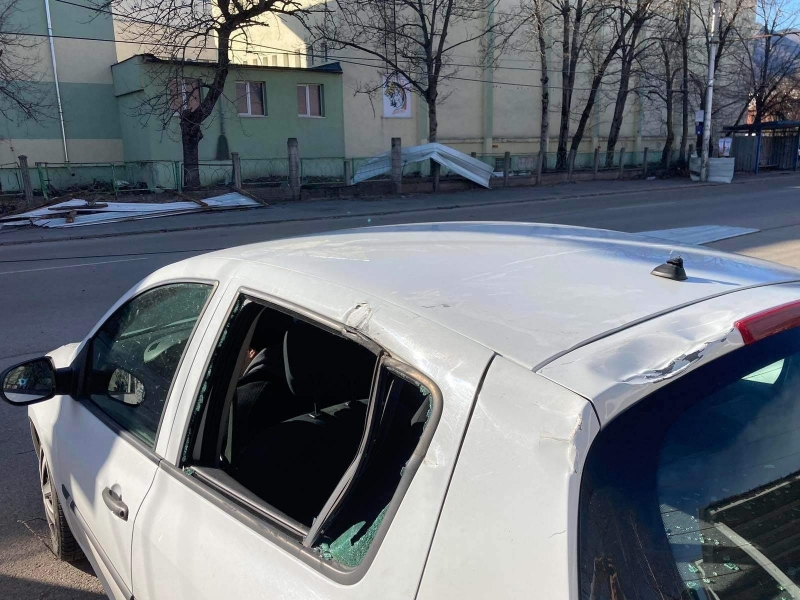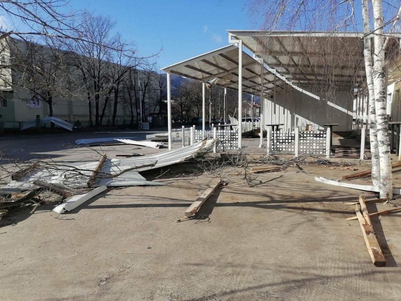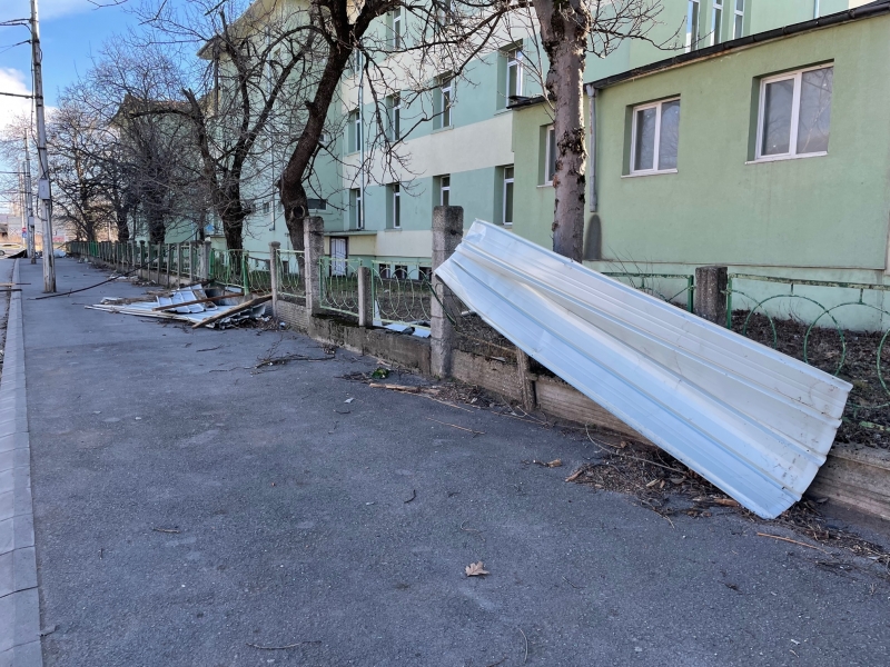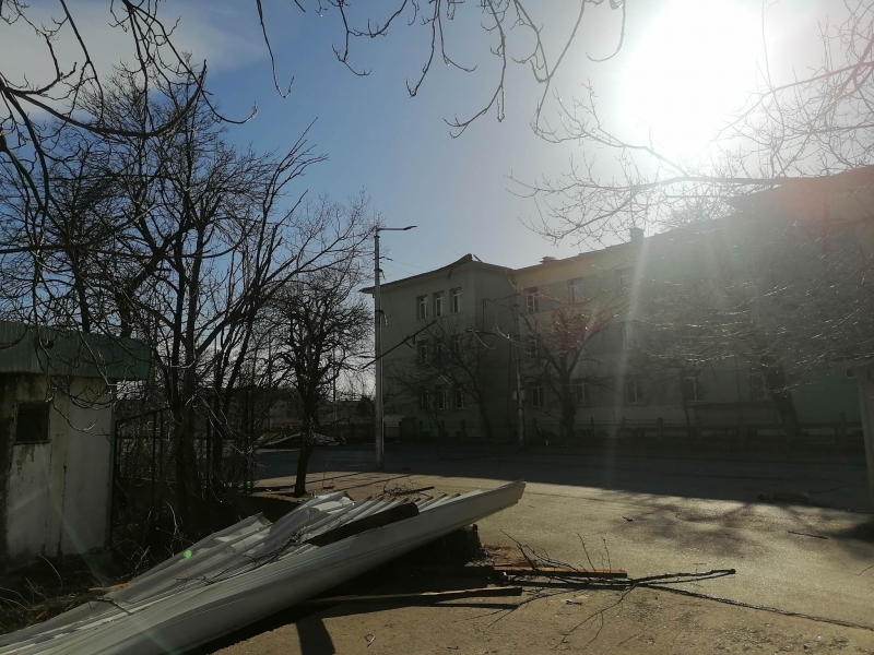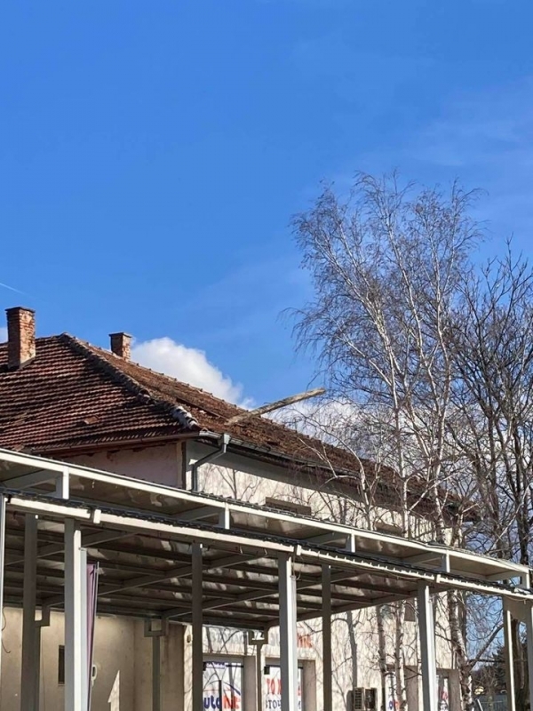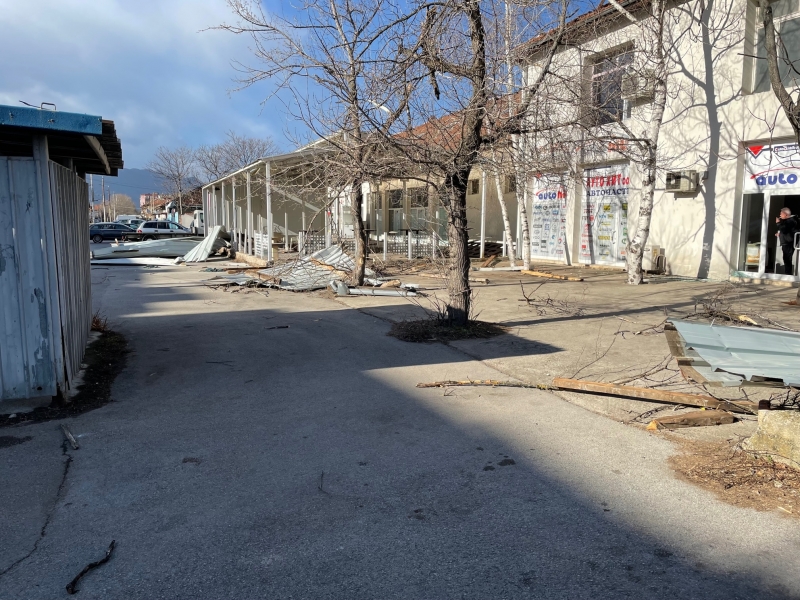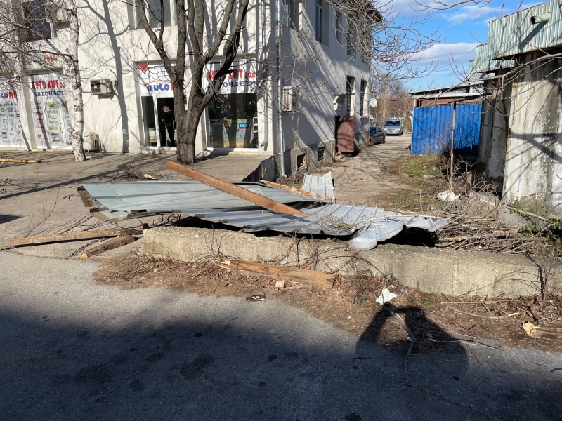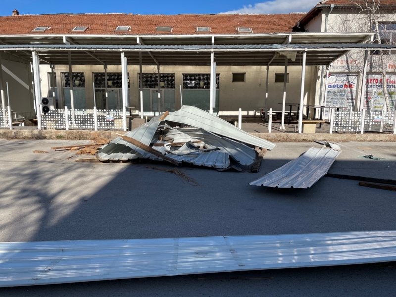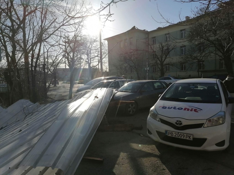 Преди минути мощният вятър събори отново покривната конструкция на сградата, в която преди се намираше Строителният техникум. В момента улица „Околчица“ прилича на тези в Киев, където обаче се води война. Падналият покрив е потрошил коли, паркирани по тротоарите и витрини на намиращи се в близост обекти. По тротоара и пътя хвърчат ламарини и клони, а кофи за боклук се носят свободно из улицата. Цяло чудо е, че няма пострадали хора, тъй като районът е много оживен.