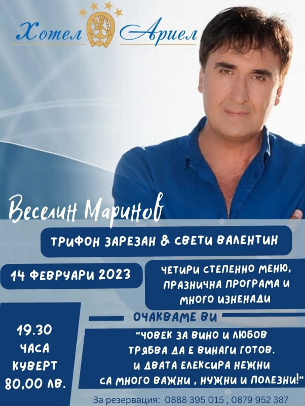 В хотелски комплекс „Ариел“ в Мездра - 4-звездното бижу на Северозапада, се готвят за наближаващия празник на виното и любовта – 14 февруари. Любимият на поколения българи Веселин Маринов ще пее за гостите на комплекса.
