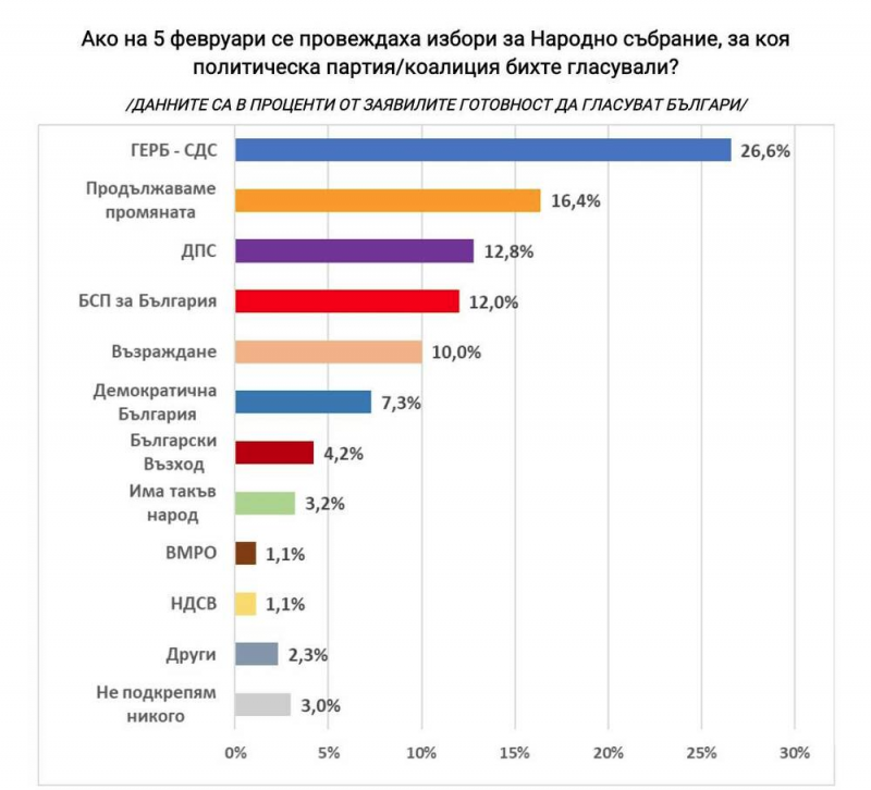 Ако на 5 февруари се провеждат избори за Народно събрание, ГЕРБ-СДС получава 26,6% подкрепа, "Продължаваме промяната" (ПП) - 16,4%. Третата позиция се запазва за ДПС с 12,8%.