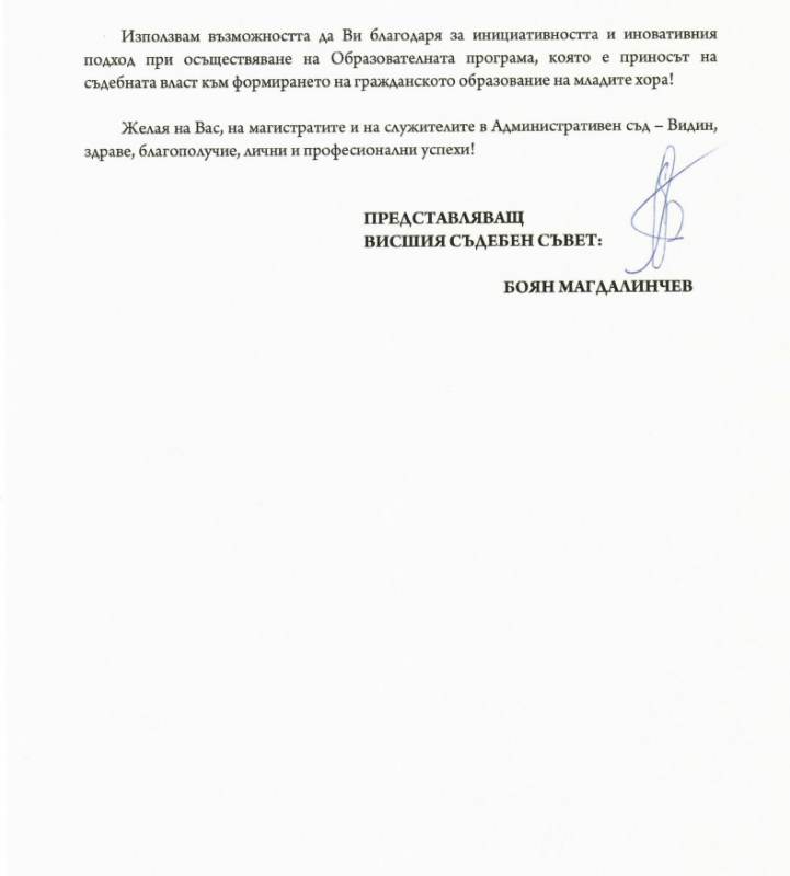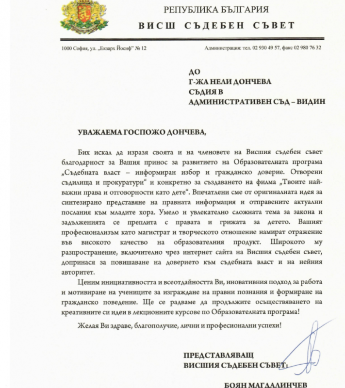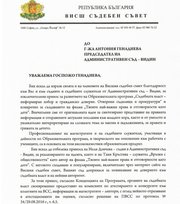 Административнят съд във Видин получи благодарствени адреси от ВСС. Те са по повод реализирането на образователен филм "Твоите най-важни права и отговорности като дете".
