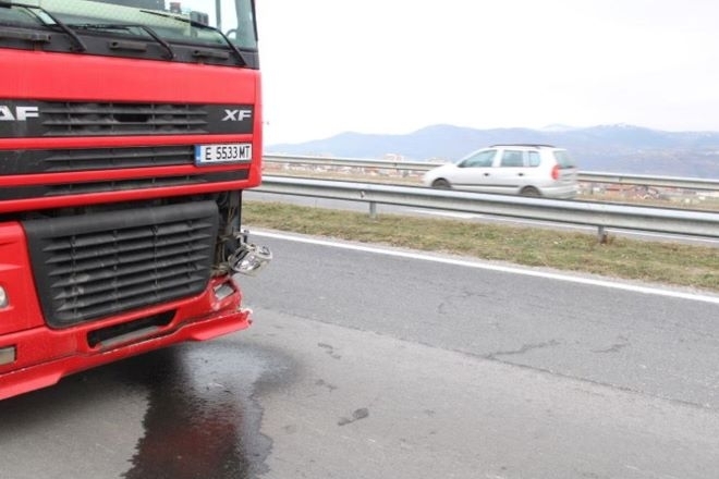Тир и лек автомобил "Пежо" се удариха на Е-79 край Благоевград, няма пострадали, според двамата водачи вина за удара има трети автомобил, който не е спрял.