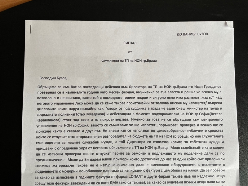 Убийствен сигнал за схемите на директора на НОИ-Враца Иван Грозданов пристигна в редакцията на агенция BulNews.