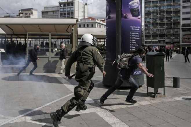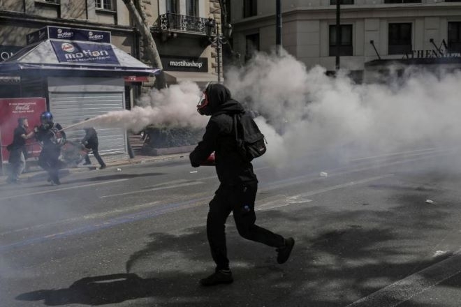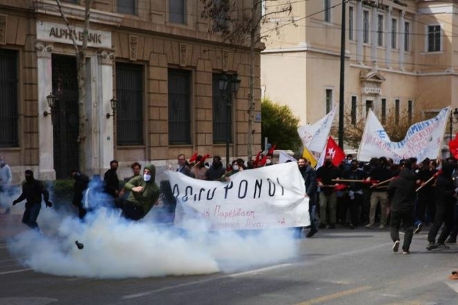 Някои демонстранти подпалиха кофи за боклук и хвърлиха коктейли Молотов, докато полицията отговори със сълзотворен газ и зашеметяващи гранати, освобождавайки площад Синтагма от протестиращите в рамките на няколко минути.