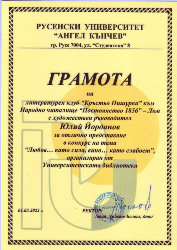 "Още в първите дни на 2023 година обсъдихме и изпратихме стихове, разкази и есета към обявените вече конкурси. Досега, спазвайки регламентите участваме в 34 от тях. И резултатите не закъсняха", добави той. Във второто издание на литературния конкурс „Любовта е извор“ журито присъди на ломчани 13 индивидуални награди. Със специална грамота „Високо педагогическо майсторство” бе награден художественият ръководител Юлий Йорданов. В националния литературен конкурс на тема "Пред любовта и виното всички са покорни", посветен на деня на влюбените – 14 февруари на Андриана Андреева беше присъдена трета награда, а в 23-тия национален поетичен конкурс "Любовта..." тя бе отличена с поощрителна награда.