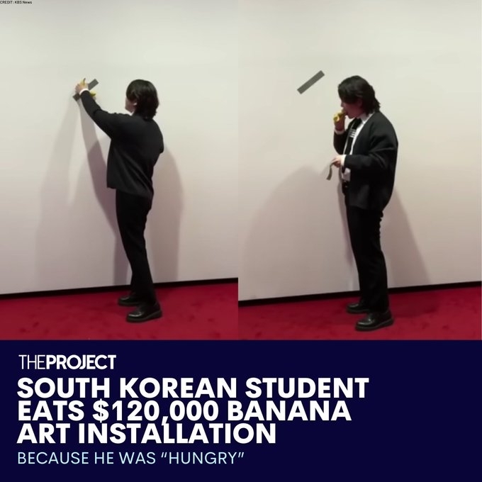 Но Хуин Су е заснет как нагло сваля банана, който е залепен с тиксо за стената в Музея на изкуствата "Лиум" в Сеул, отлепя го и го изяжда пред смаяните зрители, след което отново прикрепя банановата кора към стената със същото тиксо и си тръгва с доволна усмивка.