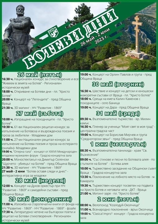 Близо 50 събития са включени в програмата на Ботеви дни, a за първа година ще има два 3D мапинга за жителите и гостите на града, съобщиха от общината във Враца.