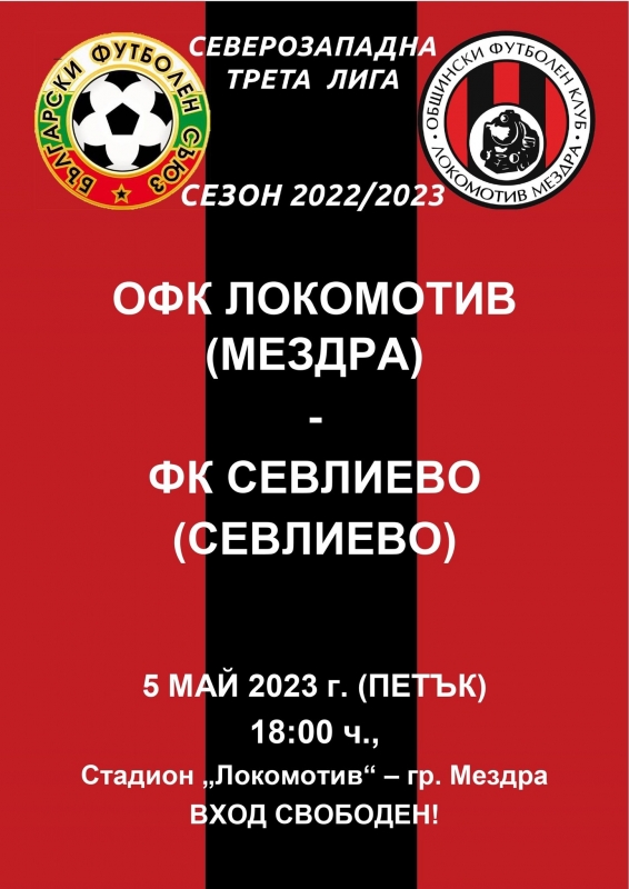 Община Мездра кани всички жители и гости на града да подкрепят местния футболен тим "Локомотив" на предстоящия им мач.