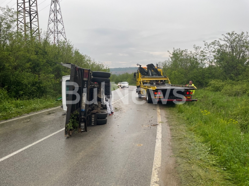 Лекотоварното “Ивеко” пътувало от Криводол в посока областния град, когато заради хлъзгава течност, разлята на асфалта, се поднесло и се преобърнало странично на пътя.