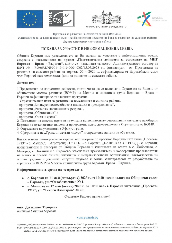 Кметът на Община Борован инж. Десислава Тодорова кани жители и гости на региона да участвуват в информационни срещи, свързани с изпълнението на проект "Подготвителни дейности за създаване на МИГ Борован – Враца – Вършец", които ще се проведат на: