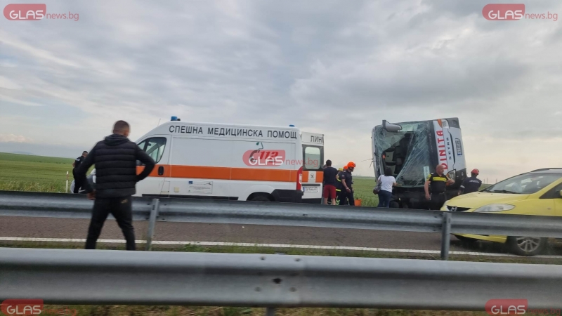 Туристически автобус се обърна на АМ "Тракия", пожарни и много линейки са на мястото /снимки/