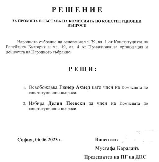 Звучи като виц, но не е. Проекторешението за избирането му като член на комисията е внесено днес от Мустафа Карадайъ в деловодството на парламента. Това се случва минути след като двамата потвърдиха, че са единствените от ДПС, подкрепили кабинета "Денков - Габриел".