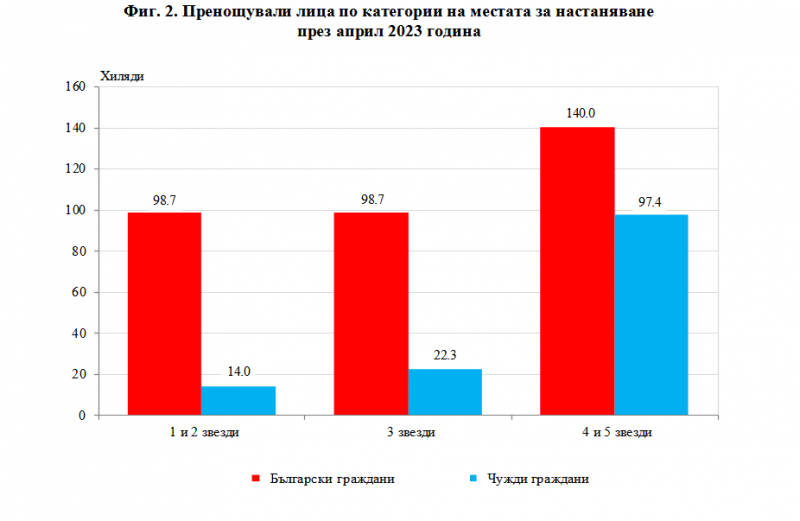 В хотелите с 4 и 5 звезди са реализирани 73.2% от общия брой нощувки на чужди и 41.5% - на български граждани. В местата за настаняване с 3 звезди са осъществени 16.7% от нощувките на чужди и 28.7% - на български граждани, докато в останалите места за настаняване (с 1 и 2 звезди) те са съответно 10.1 и 29.8%.
