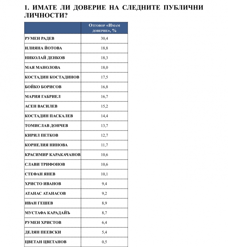 Най-одобряваният политик у нас продължава да бъде Румен Радев (30,4%). Вицепрезидентът Илияна Йотова заема втората позиция (18,8%). На трета позиция е новият премиер Николай Денков (18,3%). Мая Манолова традиционно събира симпатиите на лявата част от политическия спектър (18%). Костадин Костадинов бележи ръст и вече е на пета позиция със 17,5%. Значителен спад се регистрира при лидера на ГЕРБ Бойко Борисов (16,8%). Челната десетка оформят Мария Габриел (16,7%), Асен Василев (15,2%), Костадин Паскалев (14,4%) и Томислав Дончев (13,7%).