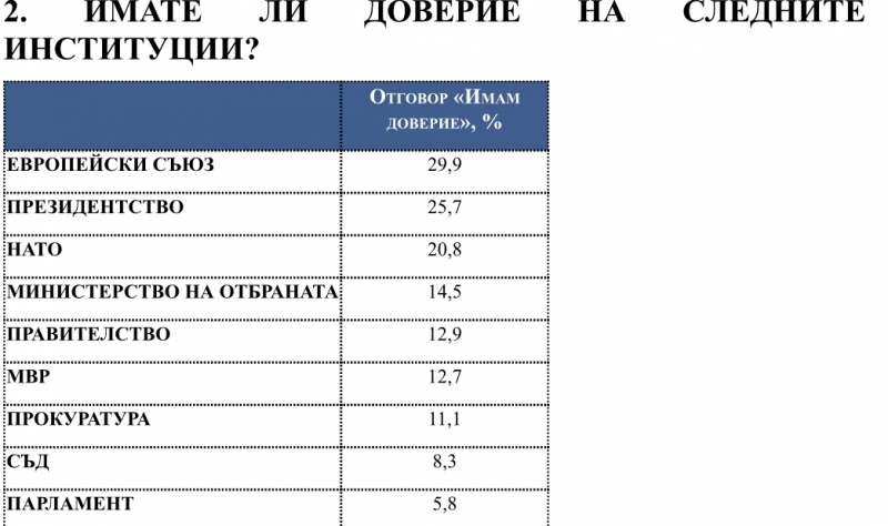 Доверието в институциите и външнополитическите фактори също е слязло на много ниски нива. Европейският съюз (29,9%) и Президентството (25,7%) се открояват като опорни точки за общественото мнение, но вече с доверие на под една трета от пълнолетните българи. Третата позиция гласоподавателите отреждат на НАТО (20,8%). Министерството на отбраната (14,5%), Правителството (12,9%) и МВР (12,7%) са с близки резултати. След тях са Прокуратурата (11,1%) и Съда (8,3%), а на последното място - Парламентът (5,8%).