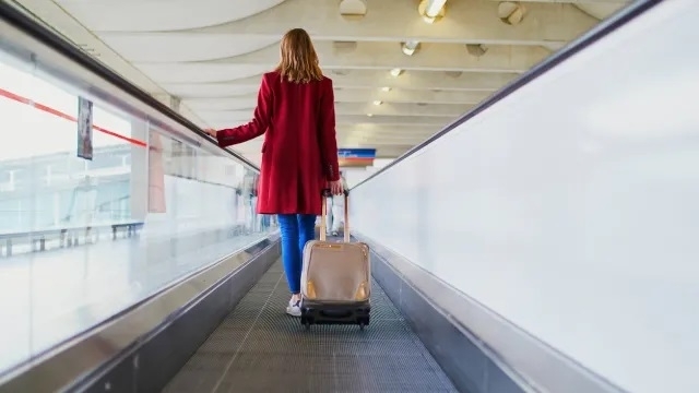 Кракът на 57-годишната жена се заклещва в пътеката, след като се спъва в куфара си, бързайки да се качи на борда на самолет.