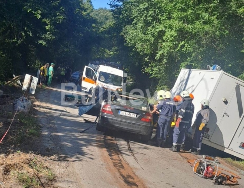 Инцидентът е станал преди около половин час край село Долно Озирово. Точно на завой са се сблъскали лек автомобил „Мерцедес“ и бус „Пежо“, които се движели в срещуположни посоки. Най-вероятно колата изпуснала завоя и се ударила в задната дясна гума на другото возило.