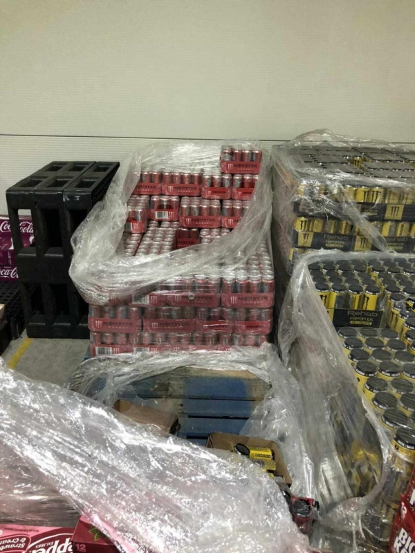 При проверката са установени складирани и подготвени за последваща експедиция пакетирани хранителни стоки и напитки от различни марки в големи количества.