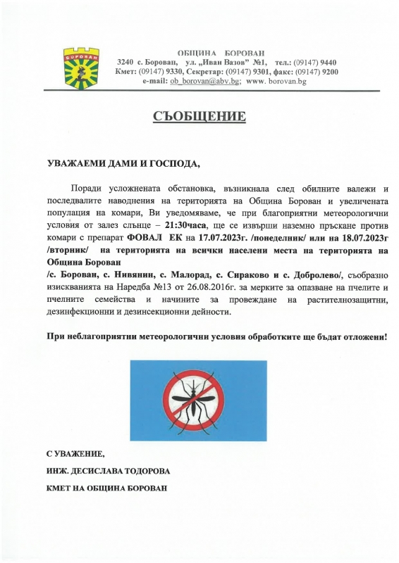 "Община Борован уведомява жителите на селата Борован, Нивянин, Малорад, Сираково и Добролево, че поради усложнената обстановка, възникнала след обилните валежи и последвалите наводнения, при благоприятни метеорологични условия на 17.07. /понеделник/ или на 18.07.2023 г. /вторник/ след 21.30 часа ще бъде извършено наземно пръскане против комари с препарат ФОВАЛ ЕК."