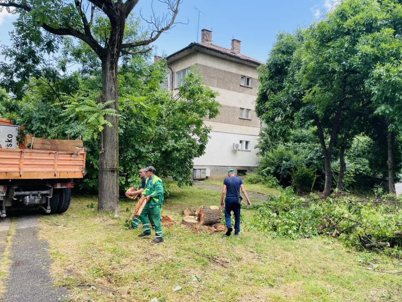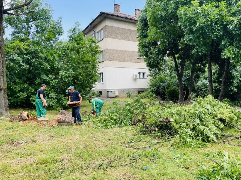 Служителите на предприятието премахват паднали дървета и счупени клони в града.