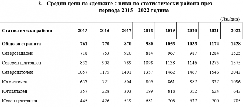 Земеделската земя е поскъпнала с 21% през последната година. По данни на НСИ през 2022 г. средната цена при сделки с ниви достига 1428 лв. на декар като предната година е била 1174 лв.
