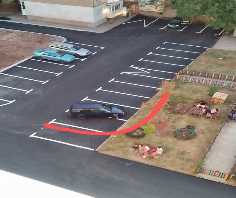 Възмутена жена качи снимки в една от фейсбук групите. На тях се вижда как неин съсед е спрял на две паркоместа, на празен и чисто нов паркинг пред блок в ж.к. „Дъбника“.