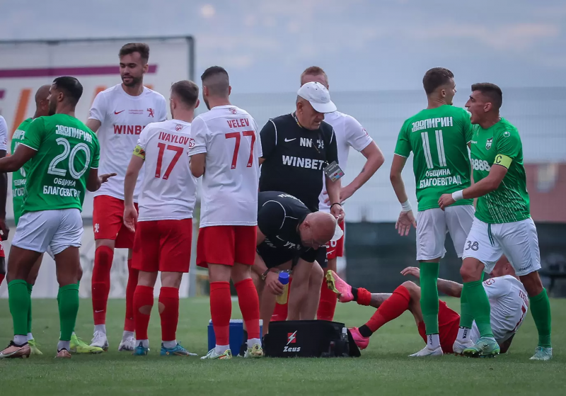 В 14-ата минута обаче Пирин остана с човек по-малко. Аймен Суда настъпи лошо Момчил Цветанов и след преглед от ВАР първоначалния жълт картон се превърна в червен.