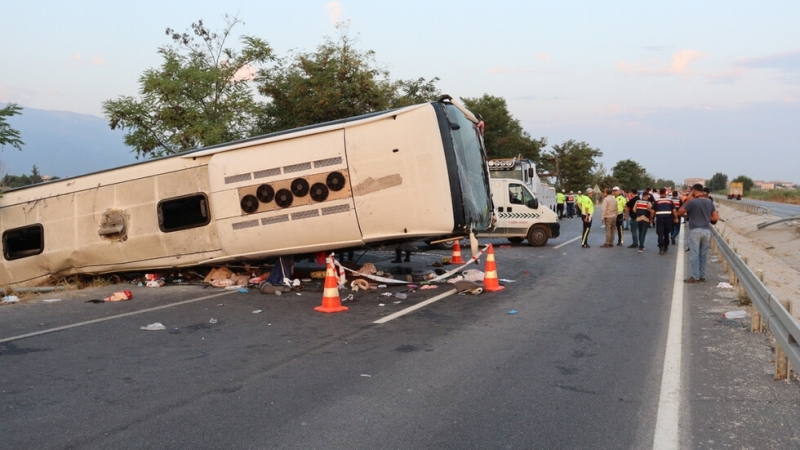 Катастрофата е станала рано сутринта в окръг Денизли. Шофьорът на камиона, натоварен с пясък, изгубил управление, навлязъл в насрещното платно и се блъснал в автобуса, който се преобърнал от удара.
