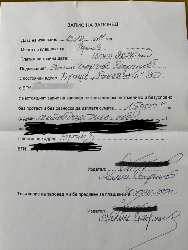 Така се стигнало до декември 2019 г., когато бизнесменът поискал от своя длъжник да попълни Запис на заповед, в която било записано, че заемът ще бъде върнат до юни 2020 г.