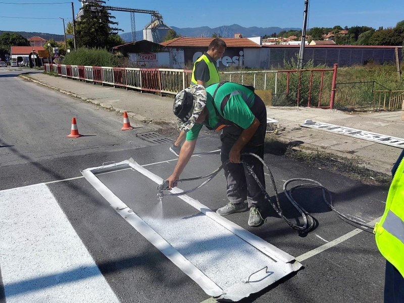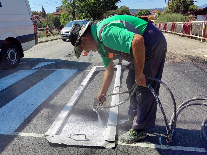 Междувременно в навечерието на първия учебен ден - 15 септември, служители на Община Мездра обновиха хоризонталната пътна маркировка по улиците с най-интензивен трафик в Мездра.