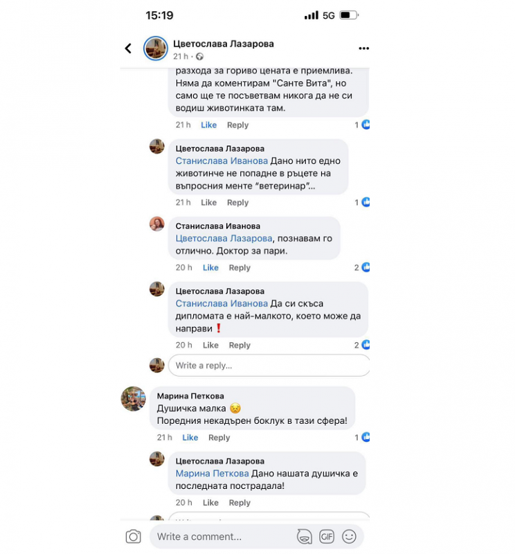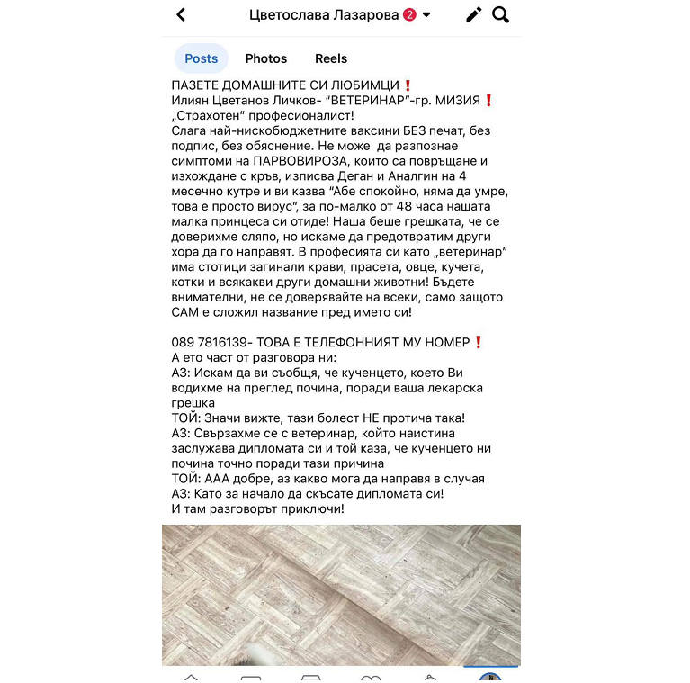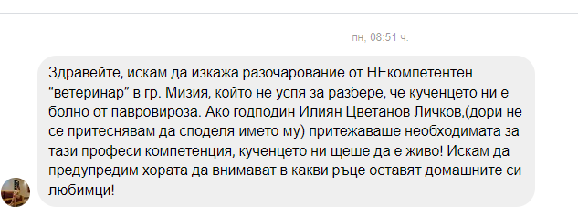 „Здравейте! Искам да изкажа разочарование от некомпетентен “ветеринар” в Мизия, който не успя за разбере, че кученцето ни е болно от „павровироза“. Ако господин Илиян Цветанов Личков, (дори не се притеснявам да споделя името му) притежаваше необходимата за тази професия компетенция, кученцето ни щеше да е живо! Искам да предупредим хората да внимават в какви ръце оставят домашните си любимци“, пише в сигнала си до нас собственичката на кучето.