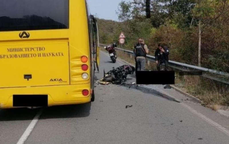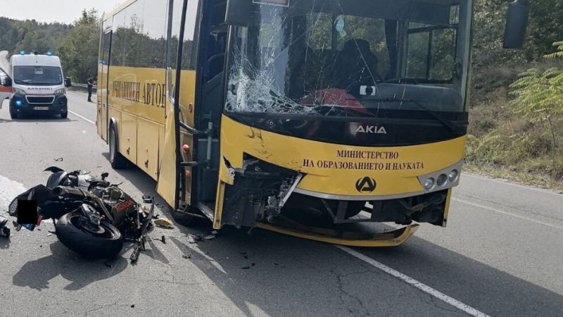 Катастрофа между училищен автобус с деца и моторист. Мъжът е загинал, след като се е сблъскал челно с автобуса.