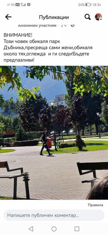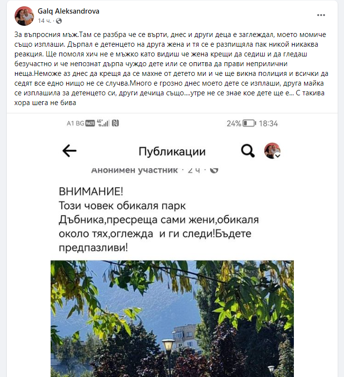 Галя Александрова е пресподелила пост със снимка на млад мъж, качен от анонимен участник в социалната мрежа. Според нея от вчера той се върти в района на парка. По нейни думи, същият е дърпал и заглеждал няколко деца, едно от които било нейното. Според нея никой не е реагирал и в двата случая, а това е недопустимо, тъй като паркът е постоянно пълен с хора на всякаква възраст, сред които и мъже, можещи да вземат отношение и да ги защитят.