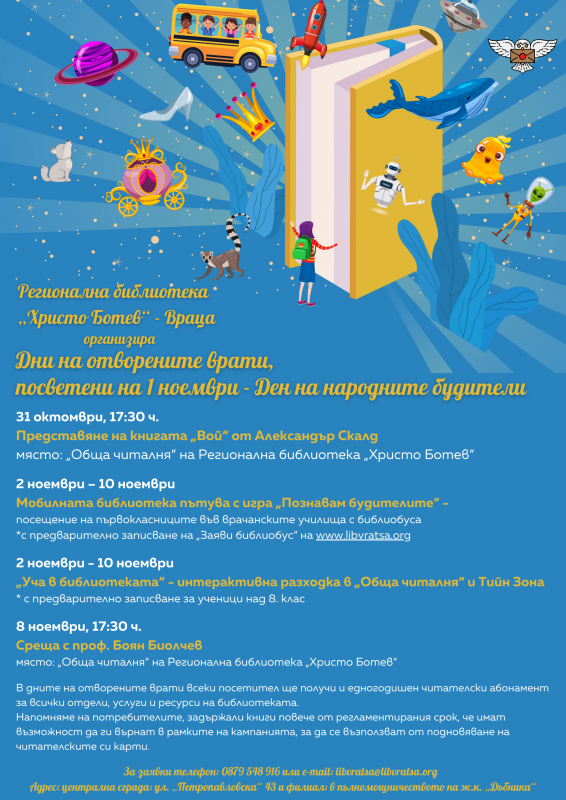 Врачанската библиотеката обявява Дни на отворените врати във времето от 31 октомври до 10 ноември 2023 г. Кампанията е посветена на 1 ноември – Ден на народните будители и ще премине с редица от събития, планирани от различните отдели.