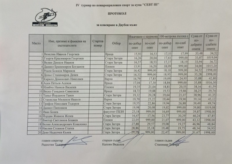 Конкуренцията беше ожесточена в "Изкачването с щурмова стълба" и в "100-метровата пътека с препятствия", но със сбор от най-добрите времена в двете дисциплини, състезателят от отбора на РДПБЗН Враца - Венелин Георгиев грабна шампионската купа.