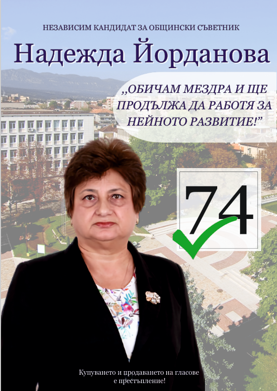 Надежда Йорданова има и 6 мандатен опит като общински съветник и се е утвърдила като личност, която безкомпромисно застава зад гърба на гражданите и бизнеса на община Мездра. Работи активно в комисиите на общинския съвет и взема активно участие в изработването на решенията му. Винаги инвеститорските предложения. За нея здравеопазването и образованието на гражданите на община Мездра е приоритет и за това подкрепя всяко едно решение, което може да доведе за развитие на общинската болница и училищните институции.