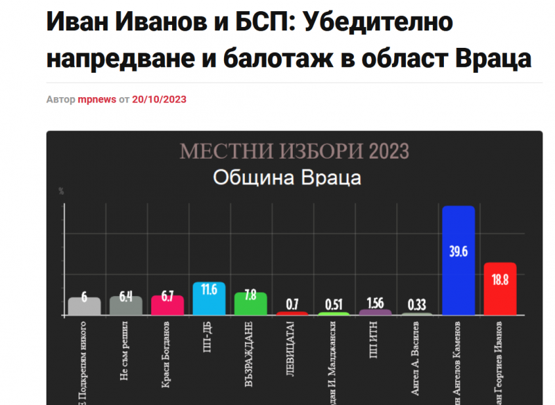 Най-надъханият сред тях беше червеният Иван Иванов. Той редовно осираше фейсбук с твърдението си, че е ТОП политик и със сигурност ще участва в балотаж срещу досегашния кмет. В името на тази цел той не се поколеба да използва дори и услугите на бияч на деца и други мутри, останали живи след бурните години на прехода. Позираше с тях, снимаше се с тях и обикаляше селата с тях. Биячът на деца даже беше включен по неясни причини в листата за общински съветници и резултатът е видим. БСП вкарва само 3-ма души и това е най-ниският резултат в историята на Столетницата във Враца.