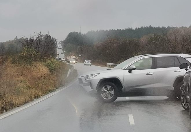 В района вали слаб дъжд, пътят е мокър и хлъзгав.
