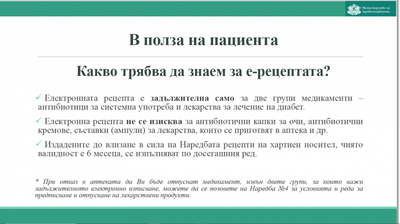 Електронната рецепта е задължителна само за две групи медикаменти- антибиотици за системна употреба и лекарства за лечение на диабет.