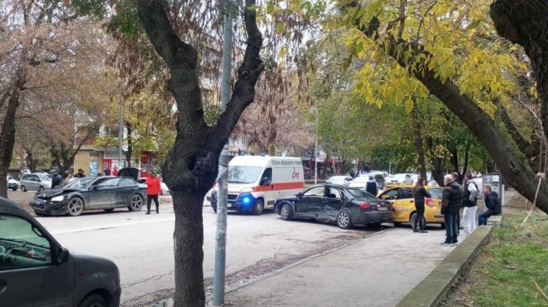 Сигналът за инцидента е постъпил в 15.20 часа днес. Кола, движеща се по улица "Цар Александър II", е ударила друга, която завивала от страничната улица "Стефан Еленков". В резултат на сблъсъка единият автомобил се е завъртял и е блъснал паркирал таксиметров автомобил.