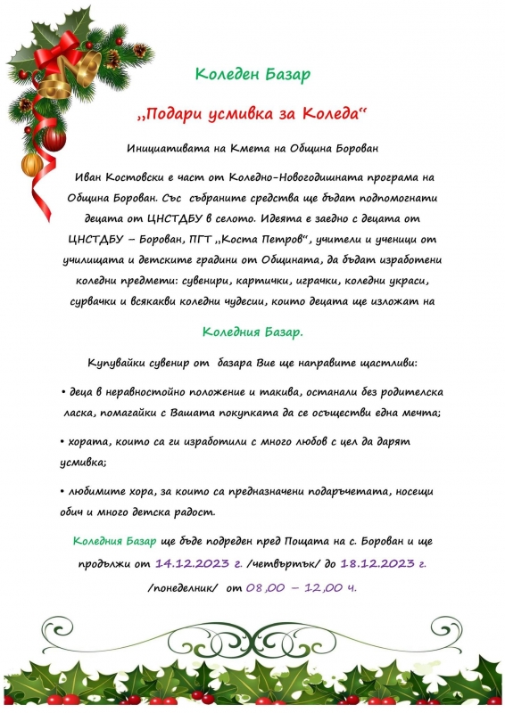 По инициатива на кмета на Борован Иван Костовски, като част от празничната програма на общината, се организира коледен базар "Подари усмивка за Коледа". Той ще се проведе от 14 до 18 деквмври.
