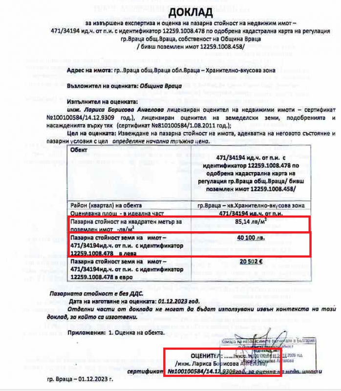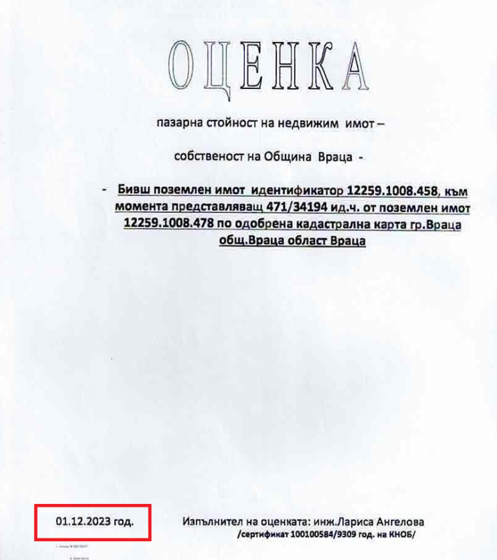 И тук се появява първата сигнална лампа в тази сделка. Оценката на земята е направена на 1 декември или 4 дни, преди служител на общината да внесе предложение тя да стане реалност. В предоставените документи от оценителя са приложени сравнителни цени на подобни терени, но те не са в същия район и нямат сходни качества с този на общината. Да не говорим, че посочените алтернативни имоти нямат излаз на Е-79, а това променя драстично цената на всеки, който го има.
