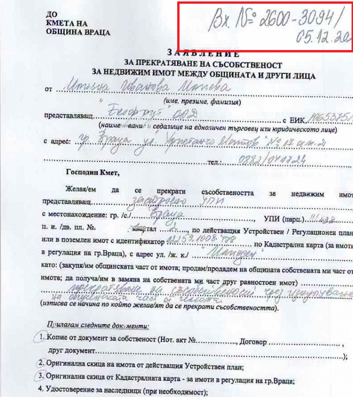 На 5 декември до кмета на община Враца е внесено заявление за прекратяване на съсобственост за недвижим имот между общината и други лица. Другото лице в случая е „Екофрут“. Част от земята на терена, който фирмата ползва за административна сграда, работилници и паркинг, е собственост на община Враца. Това парче е около 0.500 дка и според оценката на лицензирания оценител Лариса Ангелова, струва 40 100 лева или по 85.14 лв/кв.м.