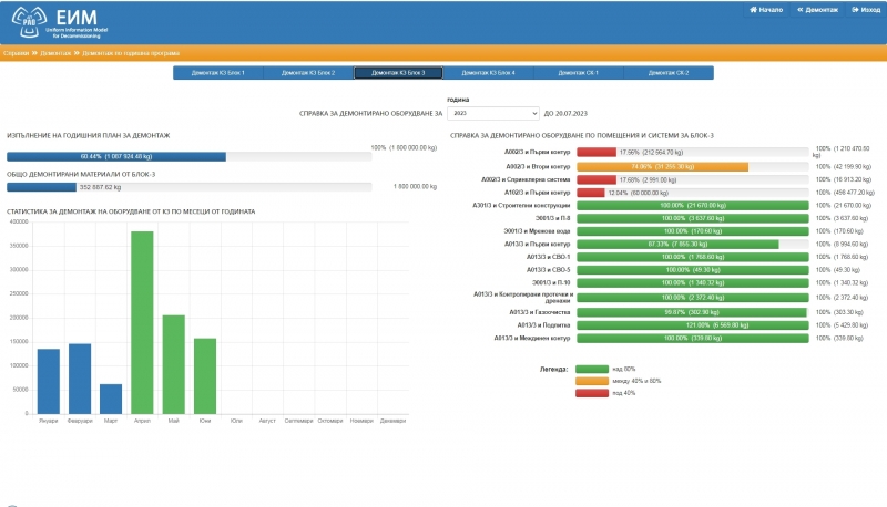 Актуалната информация за текущия демонтаж се допълва от 3D модел – софтуерен продукт, който е част от EИМ и Единна информационна система за управление на данните на ДП РАО. Той представлява подробна триизмерна визуализация на всички помещения и разположените в тях конструкции, системи и компоненти в блокове 1-4 и в Спецкорпуси 1 и 2 с цел предоставяне на детайлна техническа информация и данни за радиологичната обстановка, получена след извършено гама сканиране в Контролирана зона. В софтуера е осигурен бърз достъп до базата данни с технологични схеми на наличните системи. 3D моделът дава възможност ефективно да се използва въведената информация за целите на планиране, демонтаж и управление на материалите, като съкращава времето за търсене и анализ на необходимите данни. Всички демонтирани конструкции, системи и компоненти се отбелязват в триизмерния модел от операторите на група „ЕИМ за ИЕ“, което дава възможност за преглед на оборудването по неговото състояние („Демонтирано“, „Още не е демонтирано“, „Демонтира се“ и „Остава в експлоатация“). Тези дейности се извършват на базата на въведените актуални данни в регистрите на модул „Демонтаж” в ЕИМ.