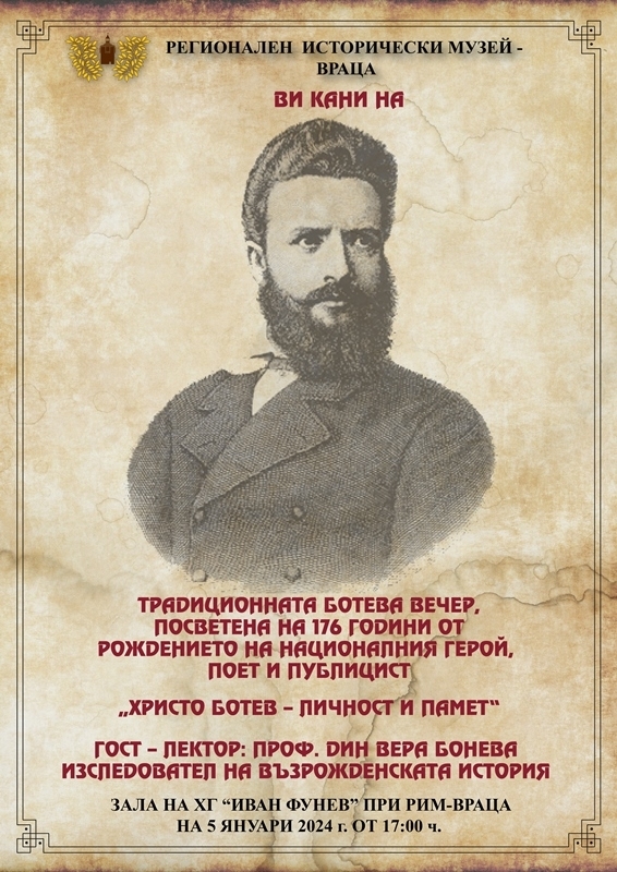 На 5 януари, от 17 ч., в Регионален исторически музей – Враца ще се проведе традиционната вечер, посветена на 176-та годишнина от рождението на българския национален герой, поет и публицист Христо Ботев.