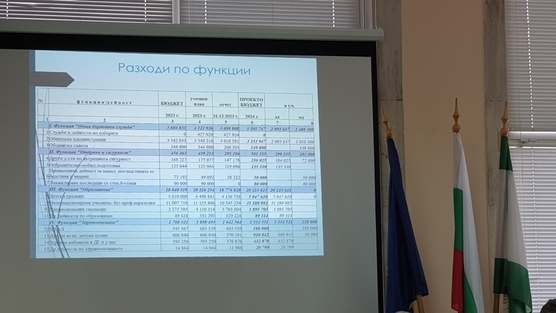 Кметът представи основните параметрите на бюджета и акцентира върху по-големите инвестиционни проекти, които ще се реализират през 2024 г. Главен експерт Силвия Маринова запозна присъстващите с детайлите на проектобюджета, който е в размер на 45 122 363 лв. в т.ч. за държавни дейности 30 639 863 лв. и за местни дейности 14 482 500 лв. Приходите от местни дейности са планирани в размер на 5 526 150 лв. Преходният остатък от 2023 г. е 9 016 024 лв. в т.ч. 6 066 767 лв. от местни дейности. С 1 444 100 лв. от местни приходи е предвидено да се дофинансират държавните дейности. Средствата са планирани така че да се постигнат заложените приоритети в програмата за управленския мандат 2023-2027 по отношение на привличането на нови инвестиции и осигуряване на привлекателна бизнес среда, подобряване на социалната и образователната инфраструктура на територията на общината. Цели се запазване и надграждане на нивото на предлаганите публични услуги в условията на продължаваща цифровизация и развитите на електронното управление.