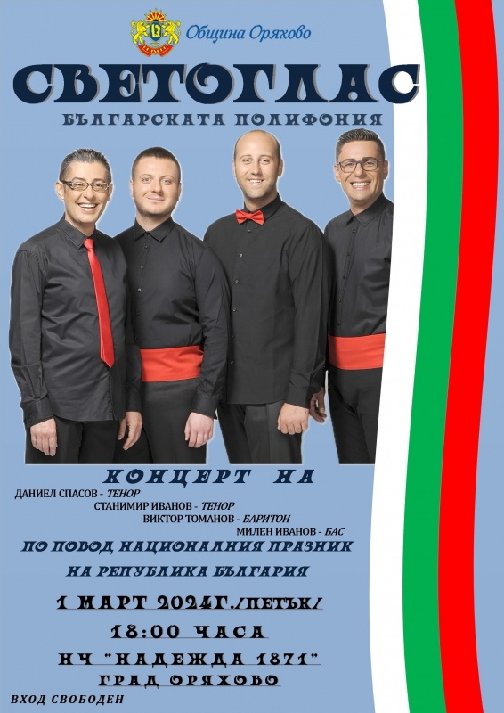 Тя стартира още на 1 март, когато в 18 чasa в салона на Народно читалище „Надежда 1871“ жителите и гостите на града ще имат възможност да се насладят на уникалните гласове, магнетичното присъствие и полифоничната звучност на Вокална формация „Светоглас“. Концертът е с вход свободен.