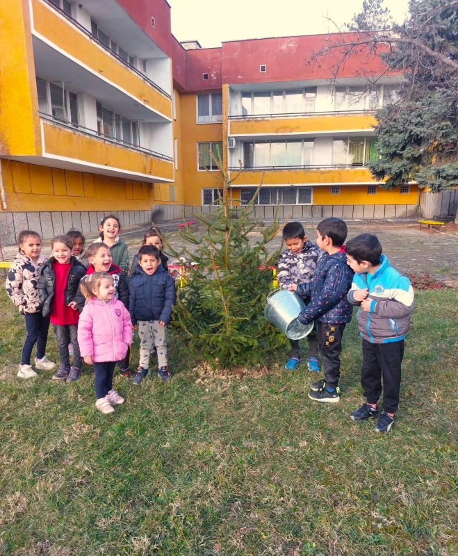 Хлапета от детска градина "Детелина" в Замфирово посадиха елхата в двора на детското заведение в селото.